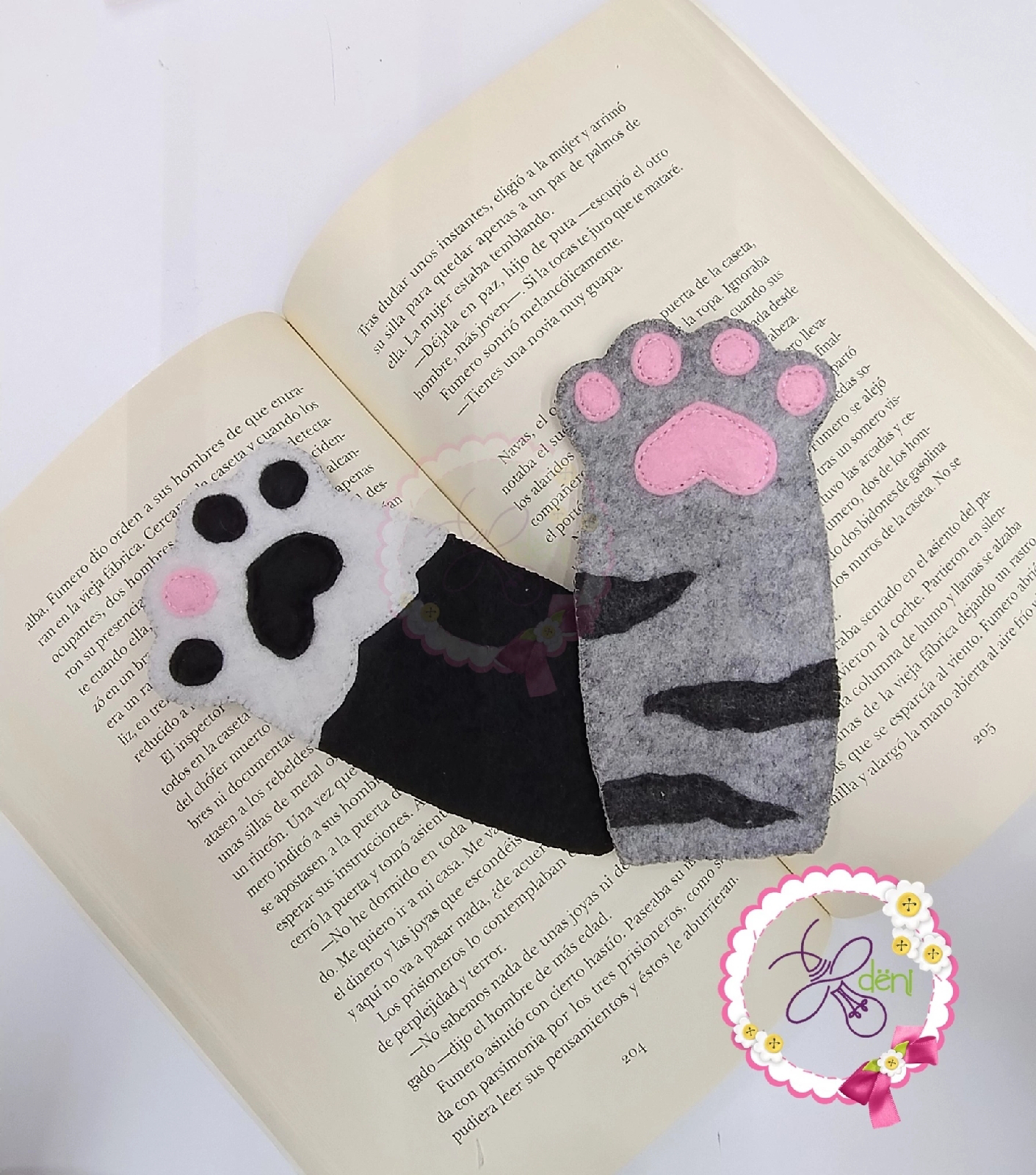 Marcador de páginas patinhas de gato em feltro, com moldes da artesã Deni Luciérnaga.... Bom dia!!!!